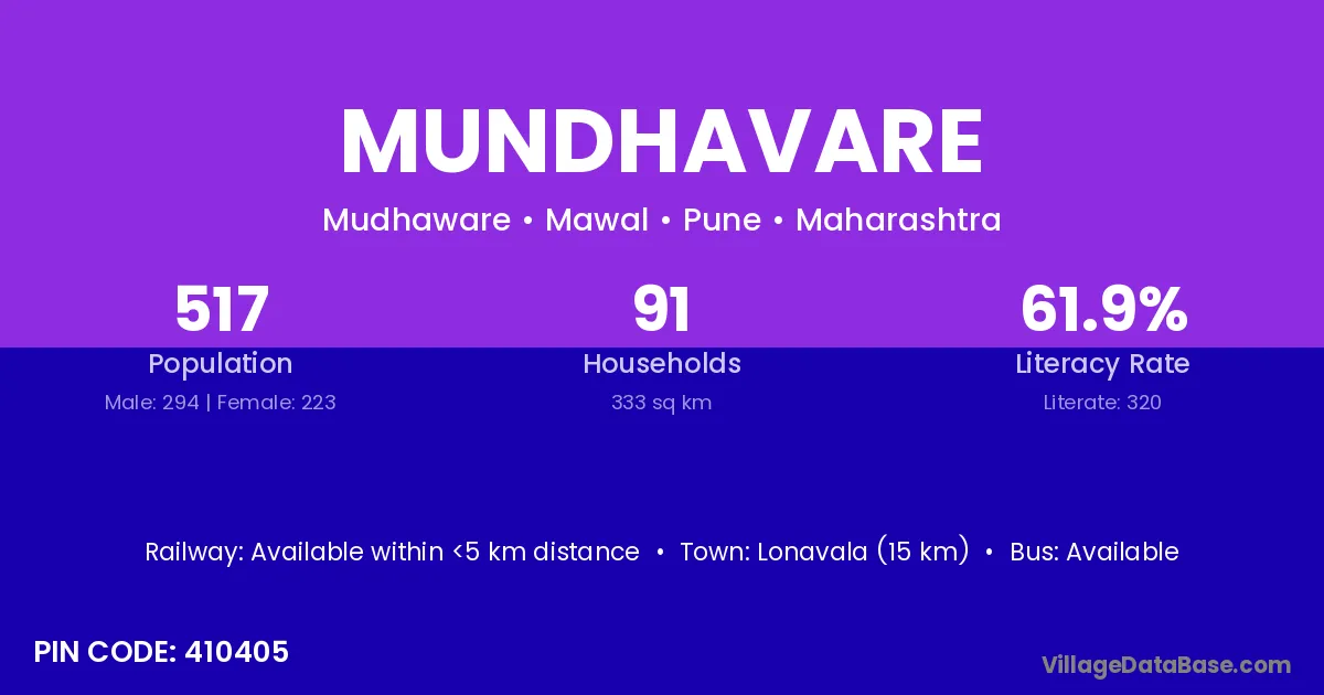 Lonavala (15 km) is the nearest town to Mundhavare village for major economic activities and is located approximately 15 km away.