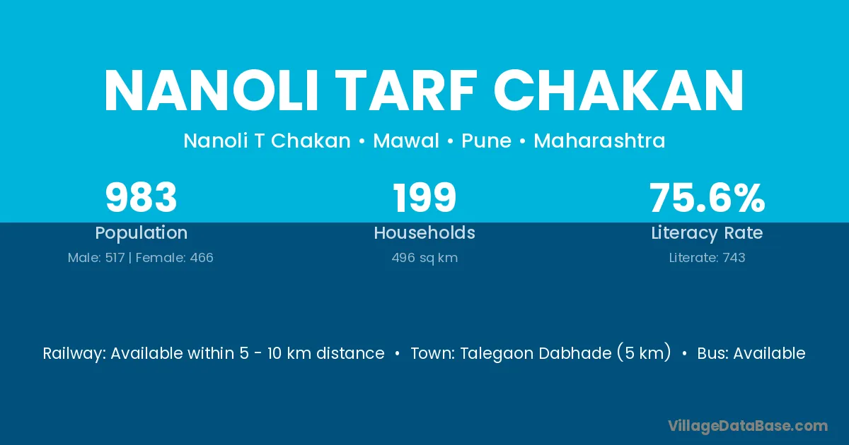 Talegaon Dabhade (5 km) is the nearest town to Nanoli Tarf Chakan village for major economic activities and is located approximately 5 km away.