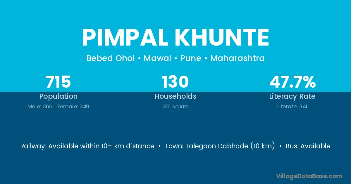 Talegaon Dabhade (10 km) is the nearest town to Pimpal Khunte village for major economic activities and is located approximately 10 km away.