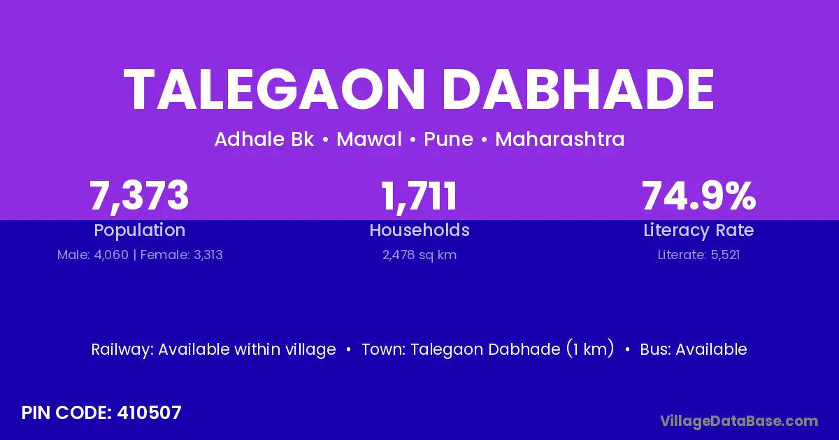 Talegaon Dabhade (1 km) is the nearest town to Talegaon Dabhade village for major economic activities and is located approximately 1 km away.