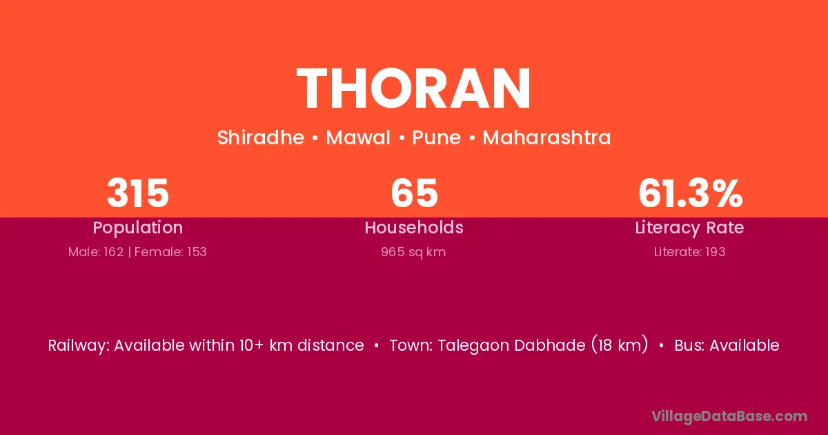 Talegaon Dabhade (18 km) is the nearest town to Thoran village for major economic activities and is located approximately 18 km away.