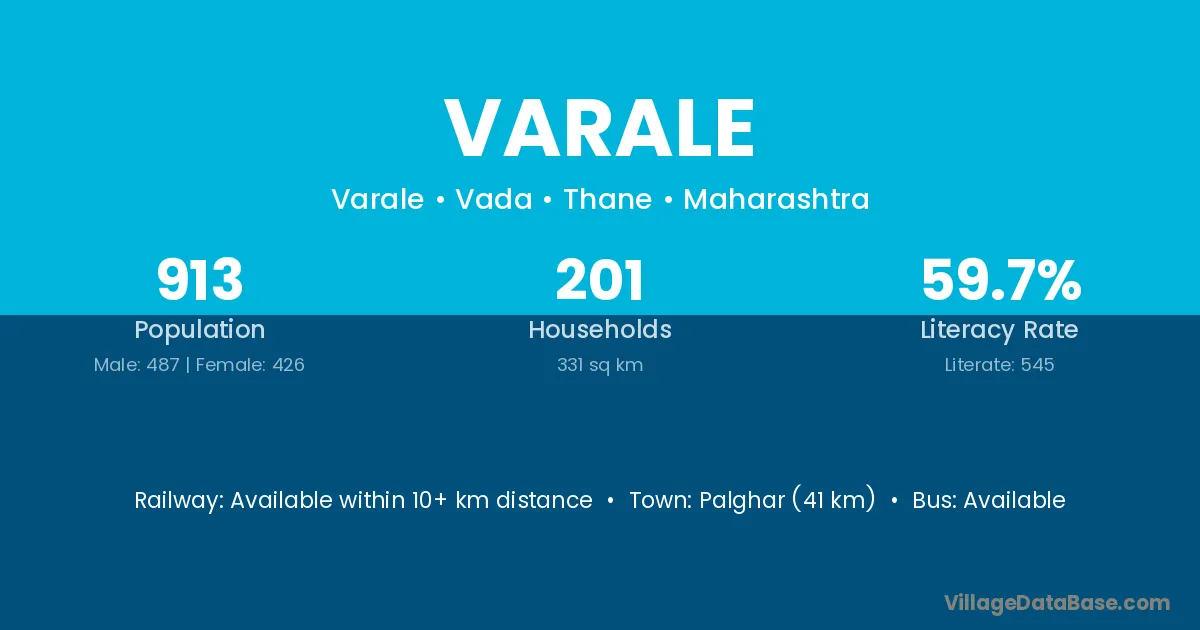 Varale village has a total population of 7,202 people, of which 3,785 are males and 3,417 are females.