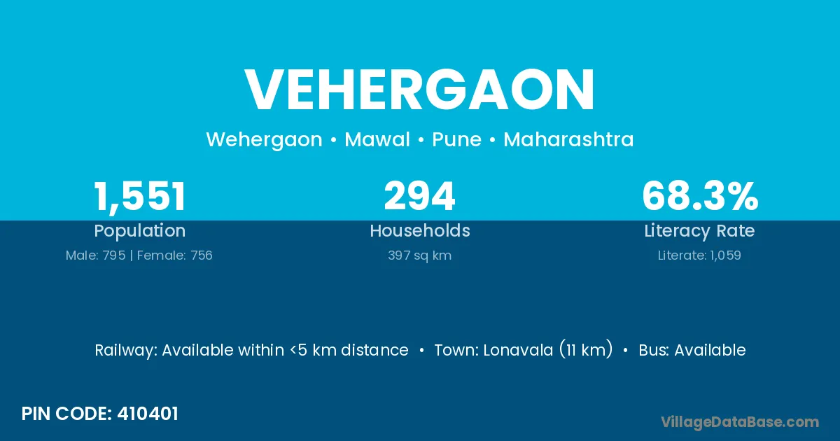 Lonavala (11 km) is the nearest town to Vehergaon village for major economic activities and is located approximately 11 km away.