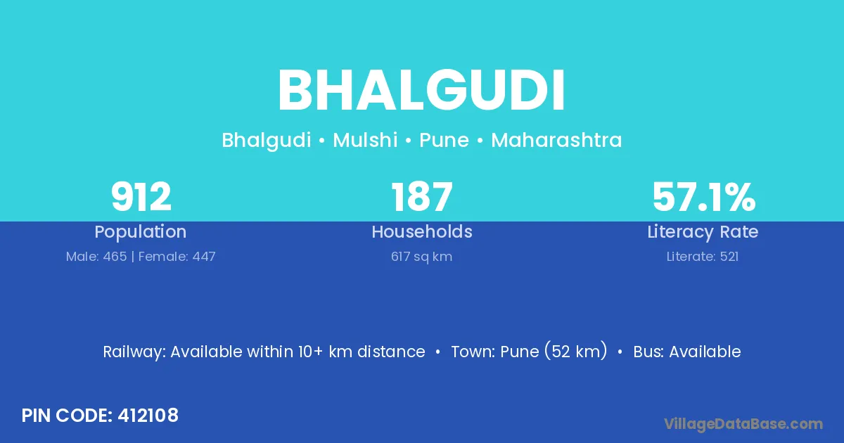 Pune (52 km) is the nearest town to Bhalgudi village for major economic activities and is located approximately 52 km away.