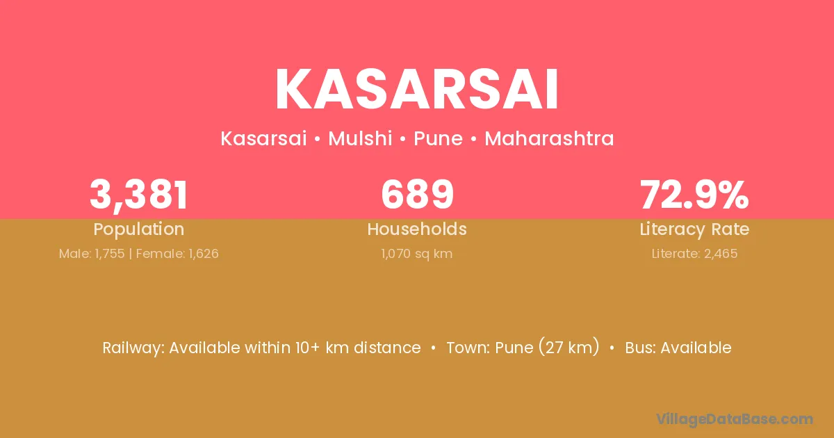 Pune (27 km) is the nearest town to Kasarsai village for major economic activities and is located approximately 27 km away.
