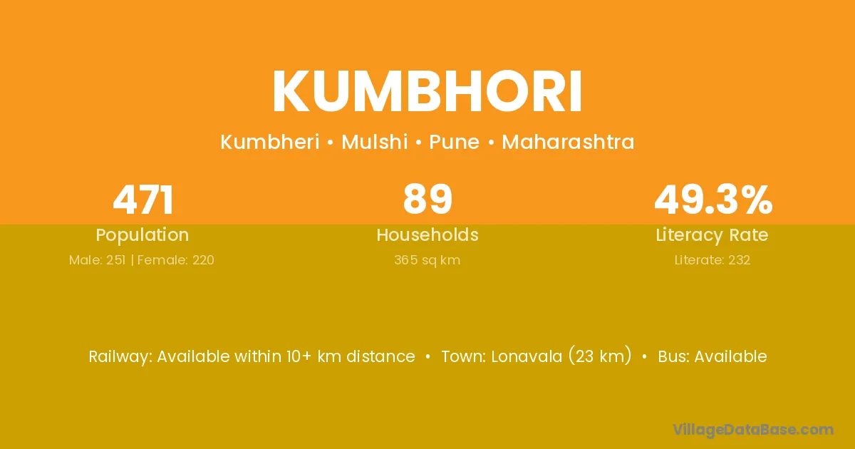 Lonavala (23 km) is the nearest town to Kumbhori village for major economic activities and is located approximately 23 km away.