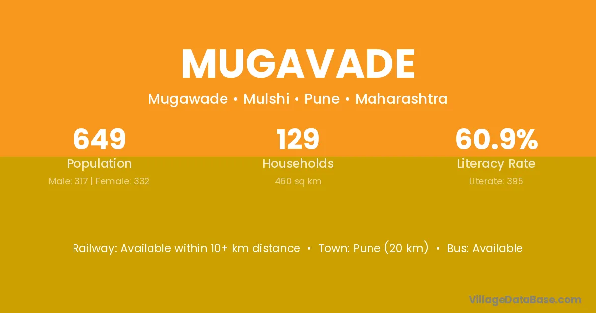Pune (20 km) is the nearest town to Mugavade village for major economic activities and is located approximately 20 km away.
