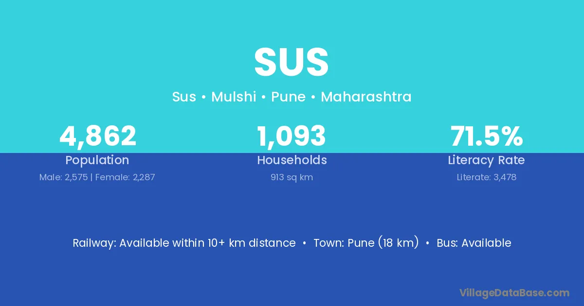 Pune (18 km) is the nearest town to Sus village for major economic activities and is located approximately 18 km away.