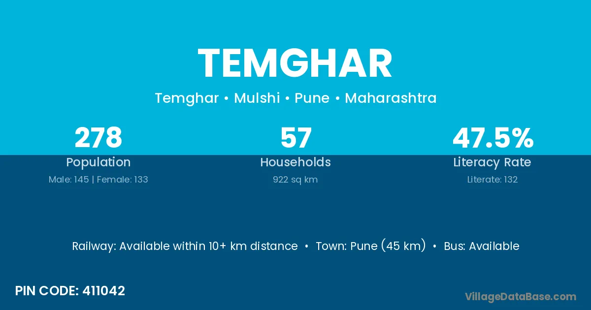 Pune (45 km) is the nearest town to Temghar village for major economic activities and is located approximately 45 km away.