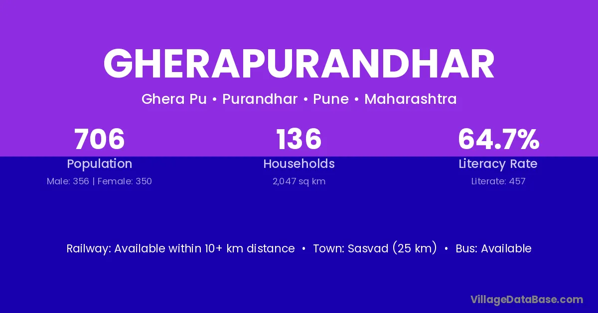 Sasvad (25 km) is the nearest town to Gherapurandhar village for major economic activities and is located approximately 25 km away.