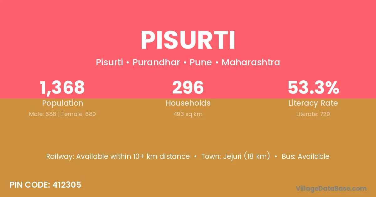 Jejuri (18 km) is the nearest town to Pisurti village for major economic activities and is located approximately 18 km away.