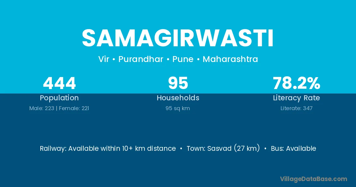 Sasvad (27 km) is the nearest town to Samagirwasti village for major economic activities and is located approximately 27 km away.