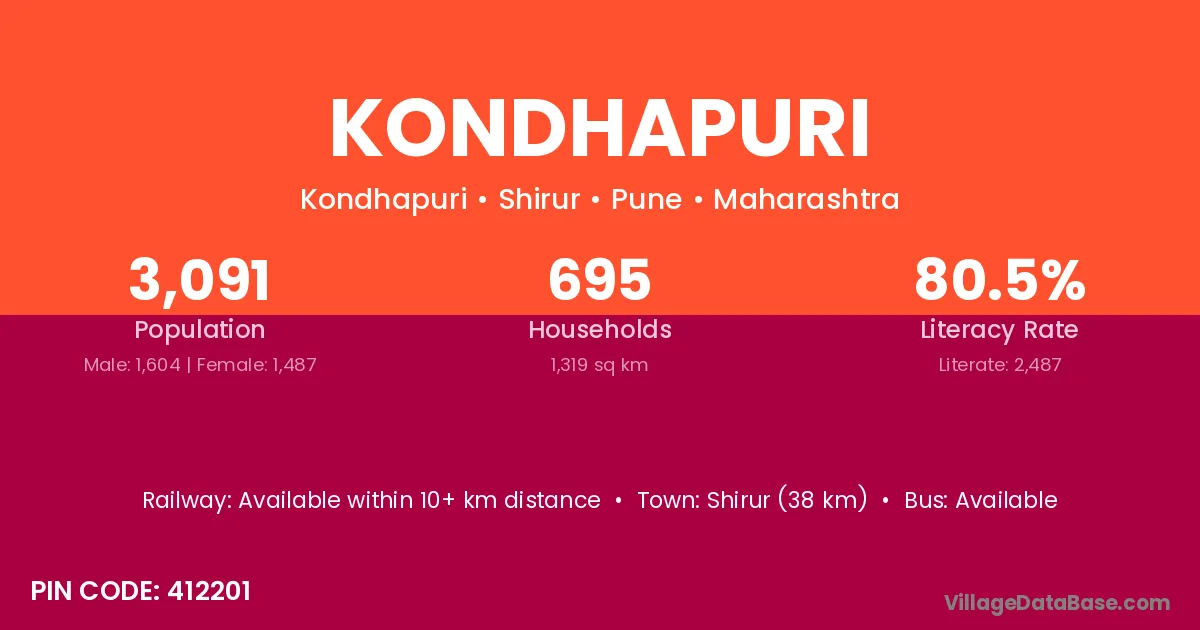 Shirur (38 km) is the nearest town to Kondhapuri village for major economic activities and is located approximately 38 km away.