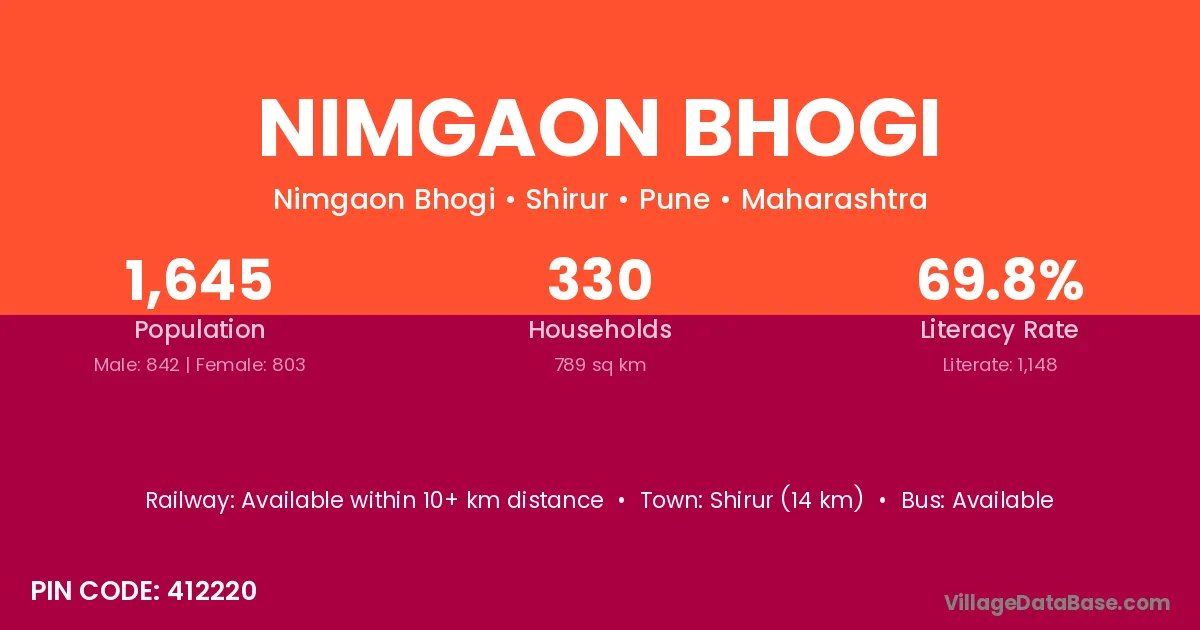 Nimgaon Bhogi village has a total population of 1,645 people, of which 842 are males and 803 are females.
