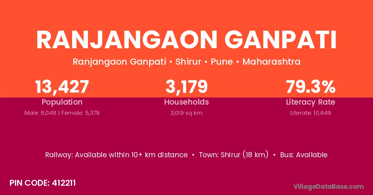 Shirur (18 km) is the nearest town to Ranjangaon Ganpati village for major economic activities and is located approximately 18 km away.