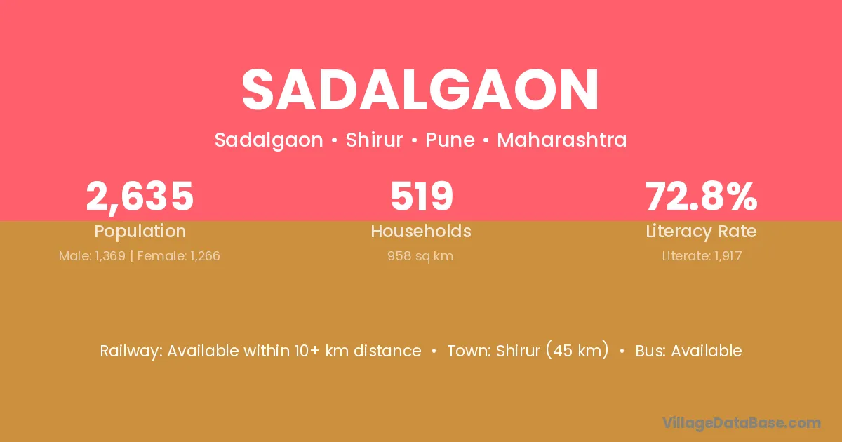 Shirur (45 km) is the nearest town to Sadalgaon village for major economic activities and is located approximately 45 km away.