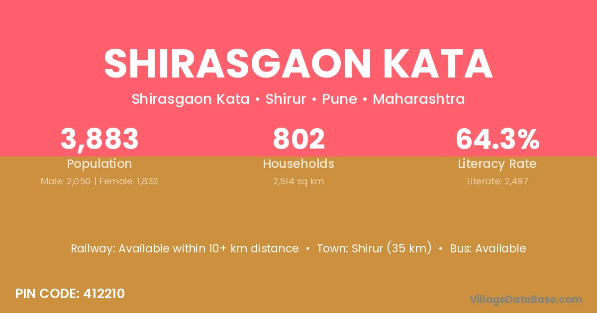 Shirasgaon Kata village has a total population of 3,883 people, of which 2,050 are males and 1,833 are females.