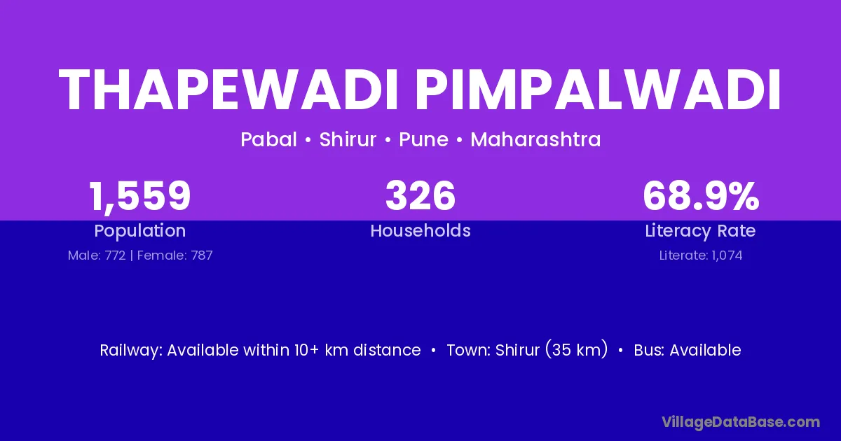 Shirur (35 km) is the nearest town to Thapewadi Pimpalwadi village for major economic activities and is located approximately 35 km away.