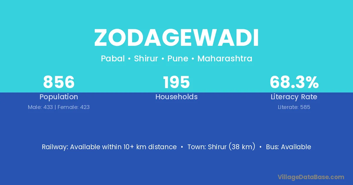 Zodagewadi village has a total population of 856 people, of which 433 are males and 423 are females.