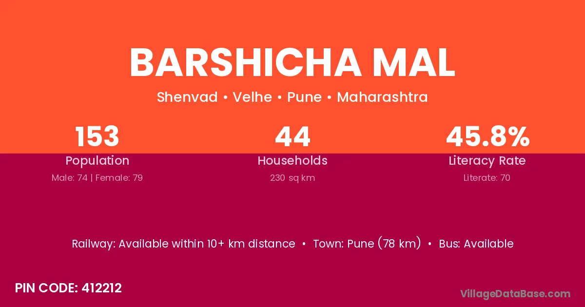 Pune (78 km) is the nearest town to Barshicha Mal village for major economic activities and is located approximately 78 km away.