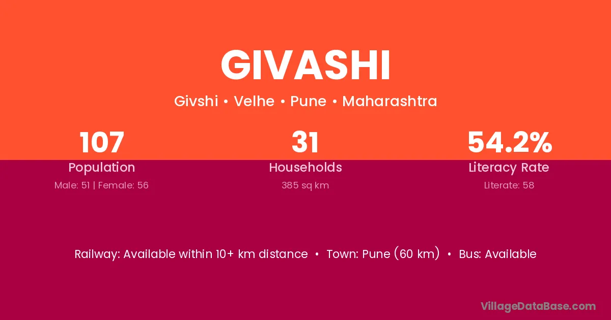 Givashi village has a total population of 107 people, of which 51 are males and 56 are females.