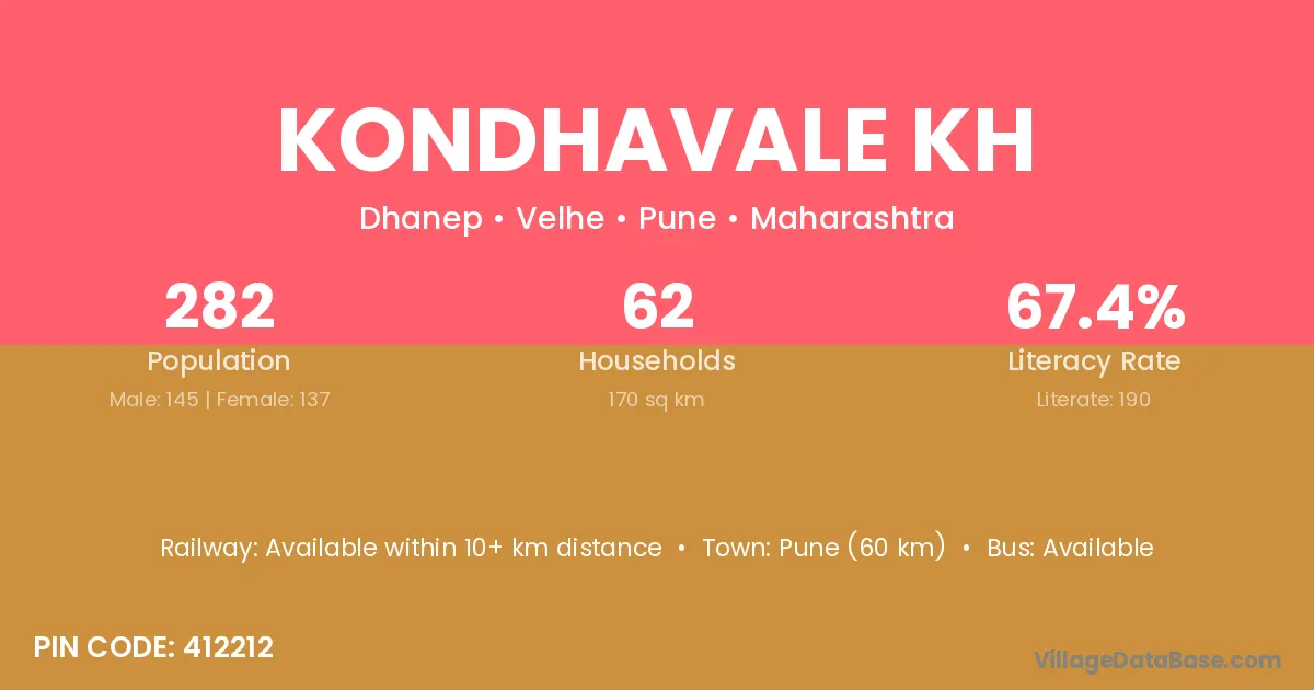 Pune (60 km) is the nearest town to Kondhavale Kh village for major economic activities and is located approximately 60 km away.