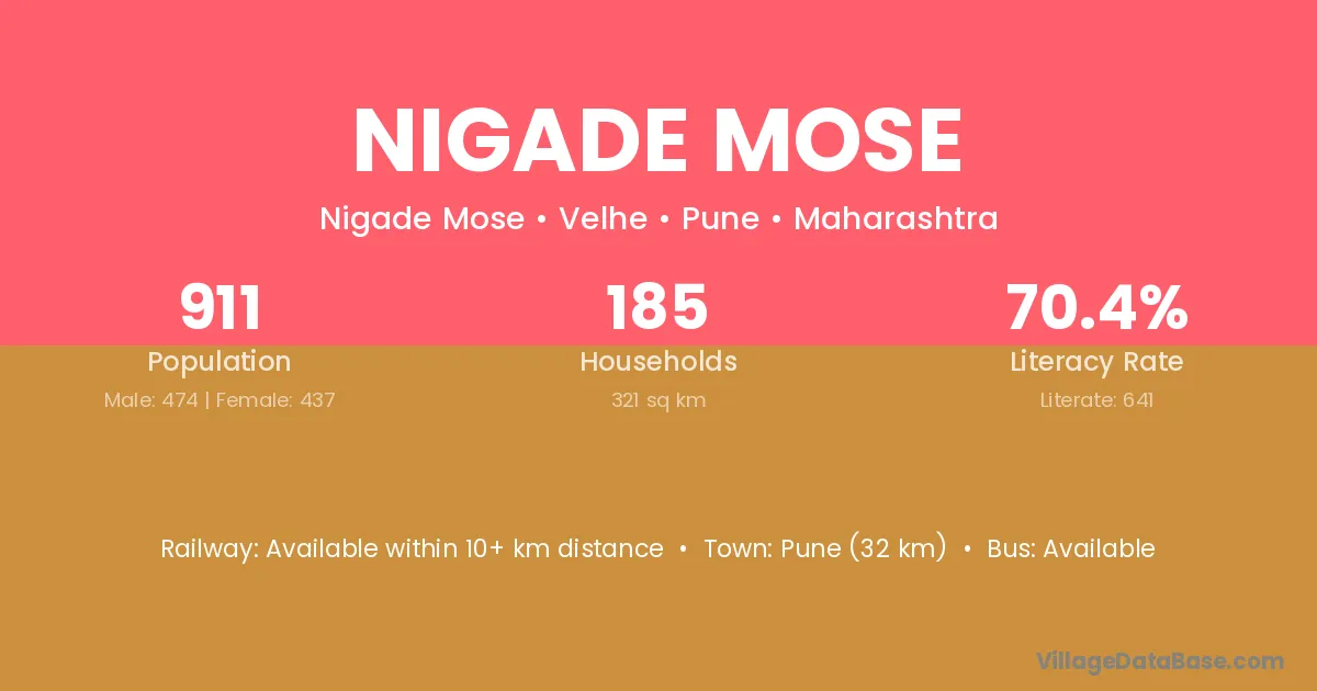 Pune (32 km) is the nearest town to Nigade Mose village for major economic activities and is located approximately 32 km away.