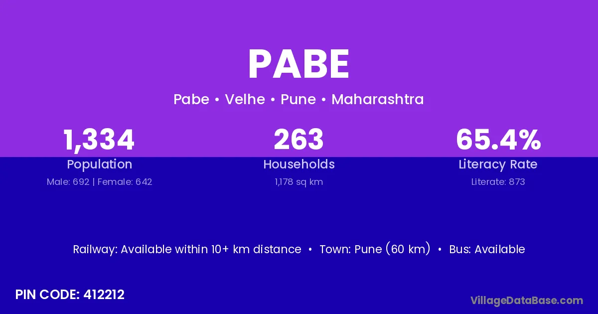 Pune (60 km) is the nearest town to Pabe village for major economic activities and is located approximately 60 km away.
