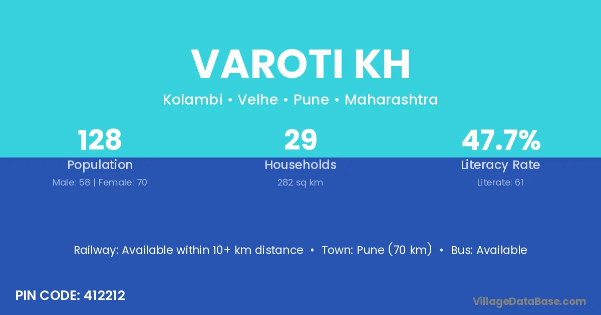 Pune (70 km) is the nearest town to Varoti Kh village for major economic activities and is located approximately 70 km away.