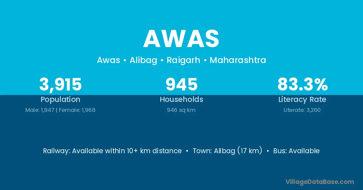 Alibag (17 km) is the nearest town to Awas village for major economic activities and is located approximately 17 km away.