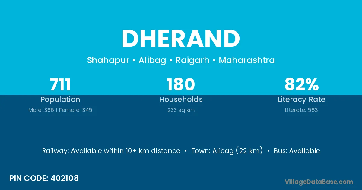Alibag (22 km) is the nearest town to Dherand village for major economic activities and is located approximately 22 km away.