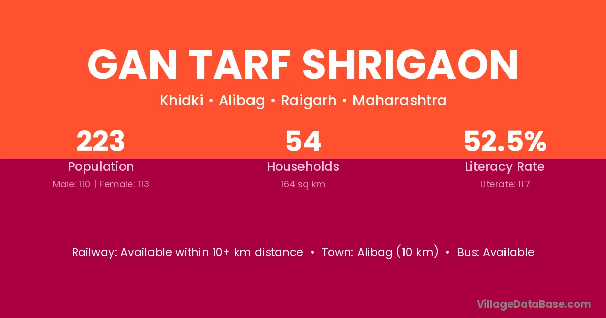 Gan Tarf Shrigaon village has a total population of 223 people, of which 110 are males and 113 are females.