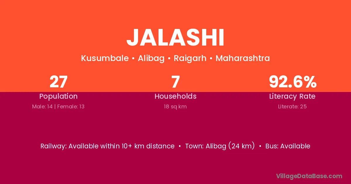 Alibag (24 km) is the nearest town to Jalashi village for major economic activities and is located approximately 24 km away.
