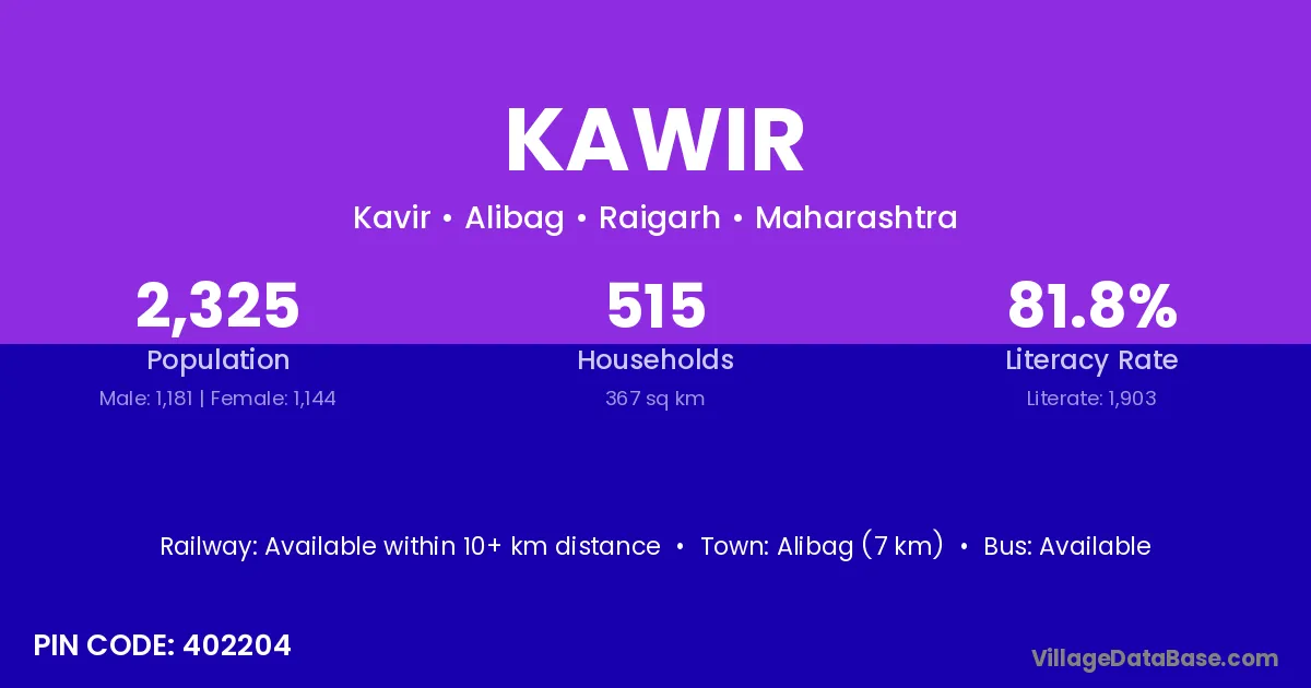 Alibag (7 km) is the nearest town to Kawir village for major economic activities and is located approximately 7 km away.