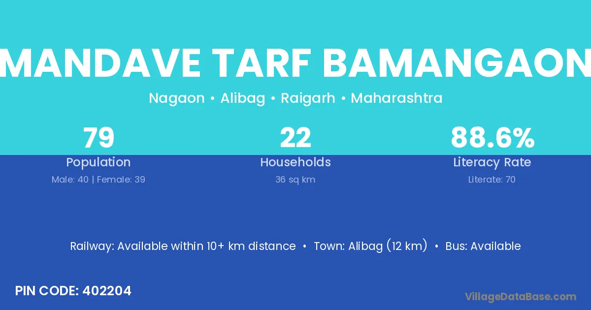 Alibag (12 km) is the nearest town to Mandave Tarf Bamangaon village for major economic activities and is located approximately 12 km away.