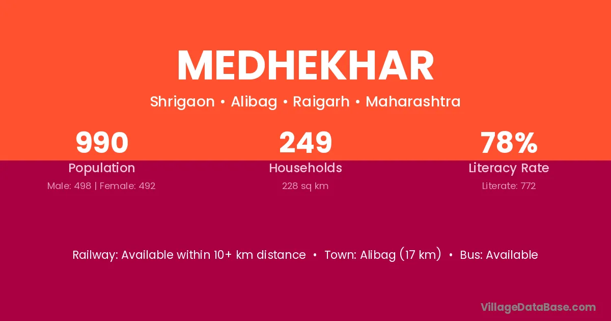 Alibag (17 km) is the nearest town to Medhekhar village for major economic activities and is located approximately 17 km away.