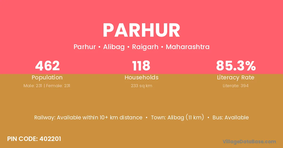 Alibag (11 km) is the nearest town to Parhur village for major economic activities and is located approximately 11 km away.
