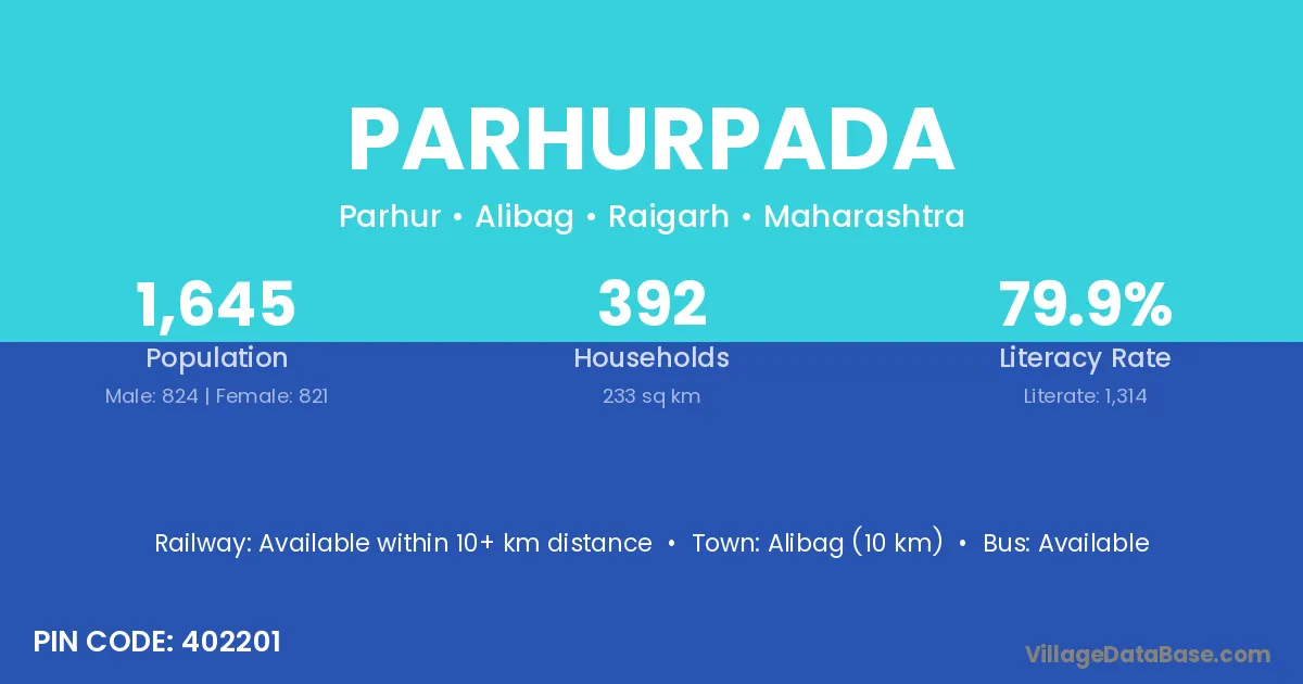 Parhurpada village has a total population of 1,645 people, of which 824 are males and 821 are females.