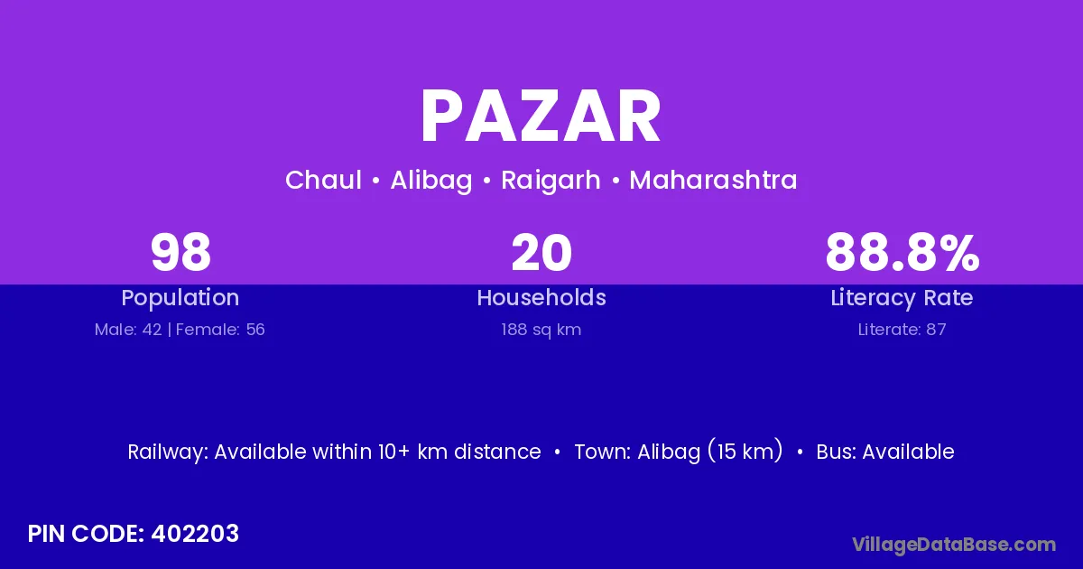 Alibag (15 km) is the nearest town to Pazar village for major economic activities and is located approximately 15 km away.
