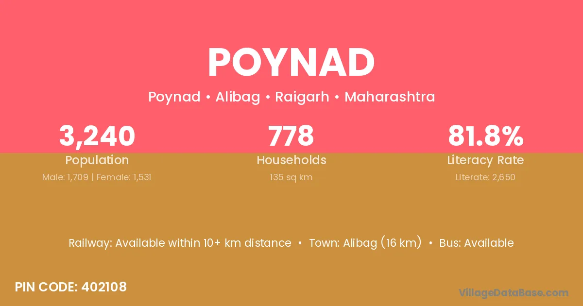 Alibag (16 km) is the nearest town to Poynad village for major economic activities and is located approximately 16 km away.