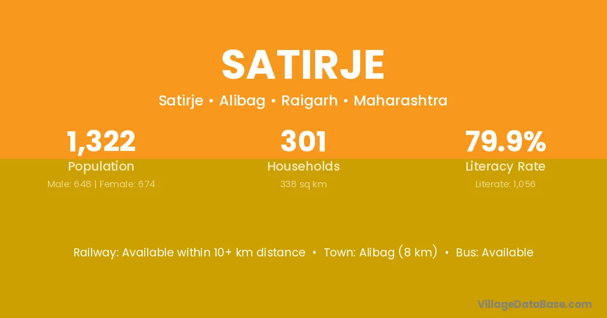 Alibag (8 km) is the nearest town to Satirje village for major economic activities and is located approximately 8 km away.