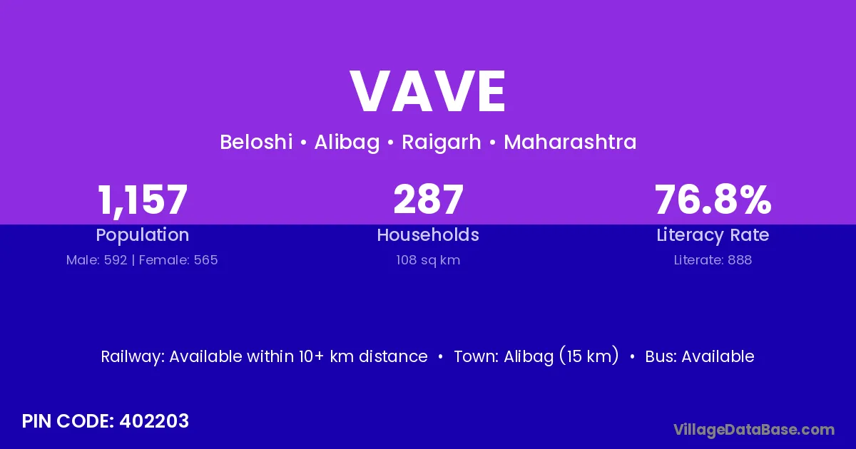 Alibag (15 km) is the nearest town to Vave village for major economic activities and is located approximately 15 km away.