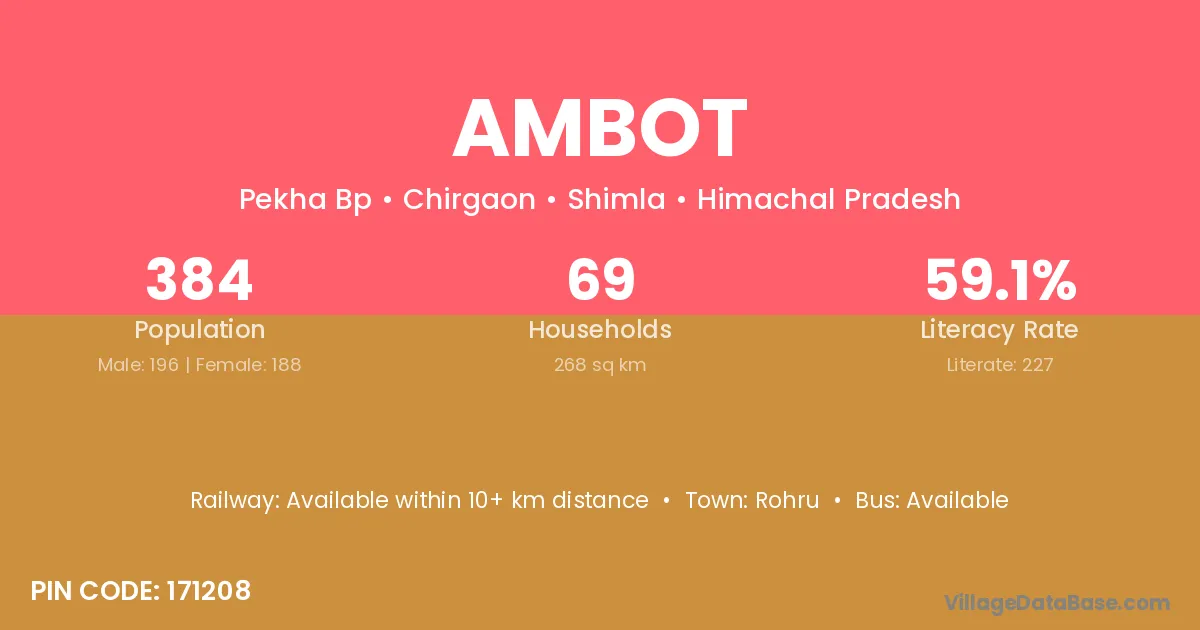 The literacy rate of Ambot village is 70.29%. Male literacy stands at 79.61% and female literacy at 60.41%.