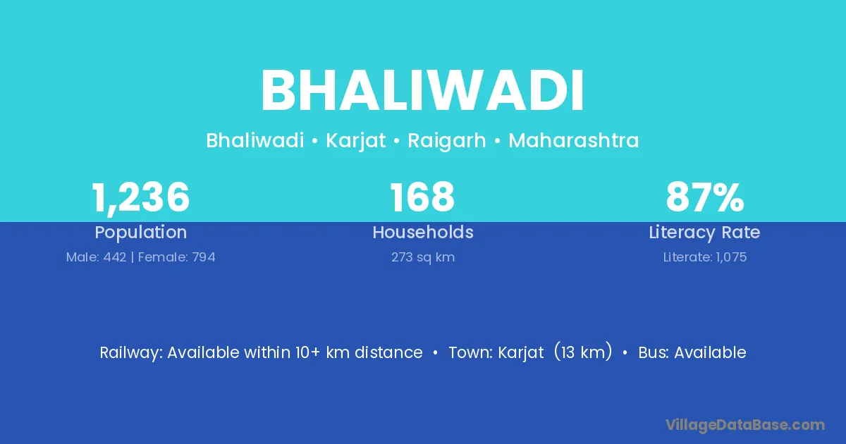 Karjat (13 km) is the nearest town to Bhaliwadi village for major economic activities and is located approximately 13 km away.