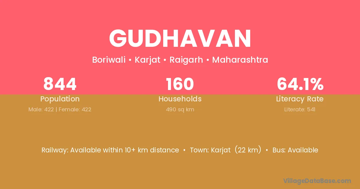 Karjat (22 km) is the nearest town to Gudhavan village for major economic activities and is located approximately 22 km away.