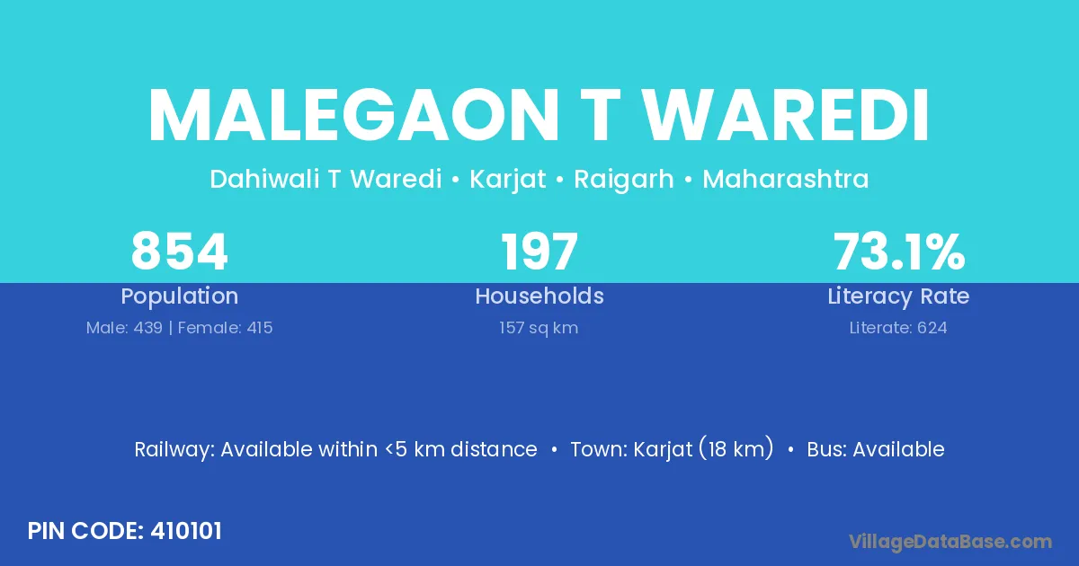 Karjat (18 km) is the nearest town to Malegaon T Waredi village for major economic activities and is located approximately 18 km away.