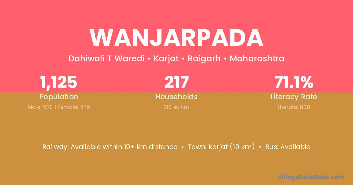 Karjat (19 km) is the nearest town to Wanjarpada village for major economic activities and is located approximately 19 km away.