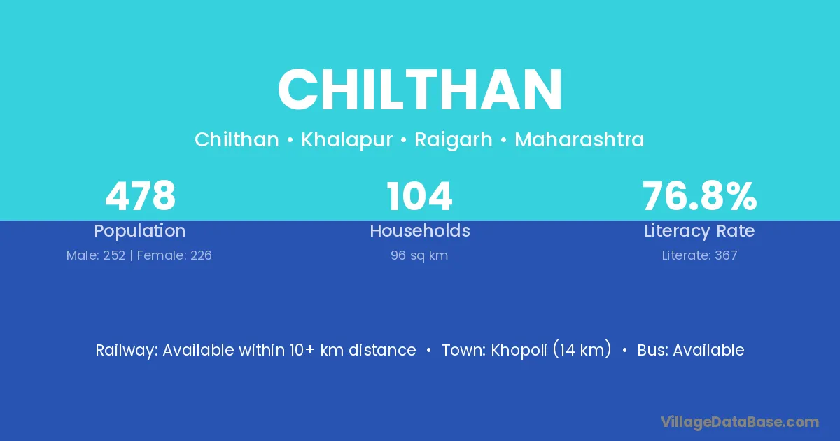 Khopoli (14 km) is the nearest town to Chilthan village for major economic activities and is located approximately 14 km away.