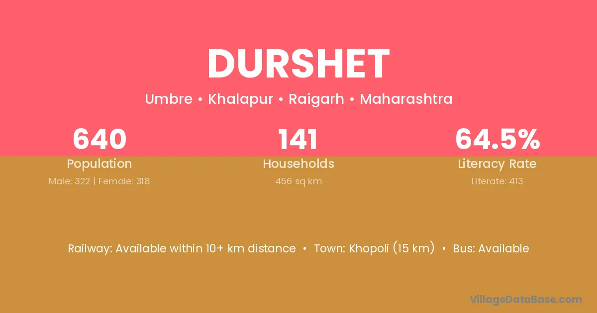 Khopoli (15 km) is the nearest town to Durshet village for major economic activities and is located approximately 15 km away.