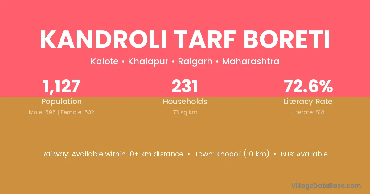 Kandroli Tarf Boreti village has a total population of 1,127 people, of which 595 are males and 532 are females.